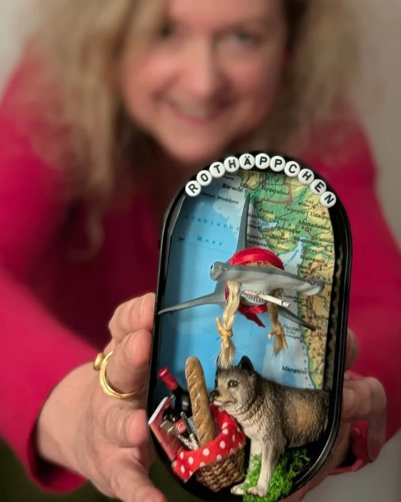 Marion bringt seit 2024 unter ihrem Label @GeweihUndSo Humor und Augenzwinkern in die Upcycling-Kunstszene. Aus Vintage-Spielzeugfiguren, Fischkonservendosen, Zigarrenkisten, Flohmarktfunden, Modelliermasse, Farben und vielem mehr gestaltet sie dreidimensionale kleinformatige Unikate mit Charme, Persönlichkeit und meist mit ein wenig Ironie.