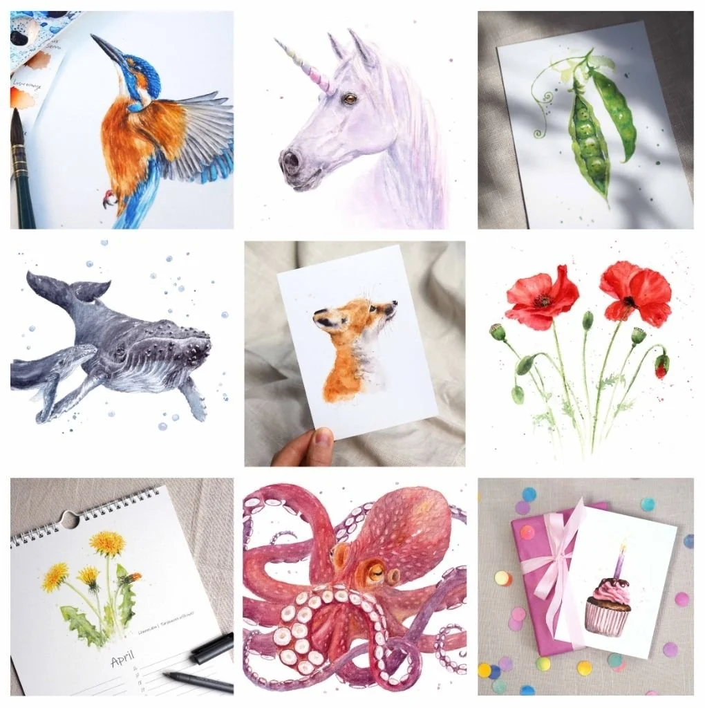 Postkarten, Kunstdrucke, Kalender und weitere Papeterieprodukte. Alle Aquarellmotive wurden mit ganz viel Liebe und Herzblut von mir gemalt und die Produkte hier in Hannover lokal gedruckt.
