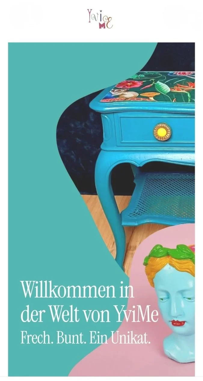 YviMe steht für bunte einzigartige Unikate. Ich redesigne und upcycle alte Möbel und kreiere ausgefallene bunte Dekoobjekte aus ganz verschiedenen Objekten. Jedes Stück bekommt von mir ein zweites Leben - kreativ, nachhaltig und mit ganz viel Liebe zum Detail. Schaut euch gern um und lasst euch überraschen. Und denkt dran: Die Welt ist bunt!